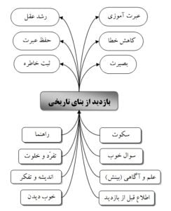 به عنوان مثال تفسیر نمودار ذیل اینگونه است که: برای «بازدید از آثار تاریخی» رعایت نکاتی مانند «سکوت»، «سؤال خوب در هنگام بازدید»، «علم و آگاهی درباره ی ساکنان بنا» و… لازم و ضروری است تا این فعالیت آثار مطلوب را داشته باشد و همچنین از نمودار استفاده می شود که آثار مورد انتظار از انجام این فعالیت مواردی از قبیل «رشد عقل»، «عبرت آموزی»، «ثبت خاطره»، «حفظ عبرت»، «کاهش خطا» و … می باشد.